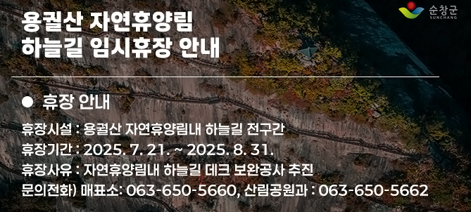 용궐산 하늘길은 순창의 풍경을 시원하게 조망할 수 있는 트레킹 코스로, 데크로 이어진 길을 걸으면 발아래로 펼쳐진 풍경이 시원하게 내려다보입니다. 하늘길을 걷다 보면 주변 자연과 어우러진 소나무 숲길이 이어져 피톤치드를 가득 느낄 수 있습니다. 장군목은 용궐산 아래에 위치한 기암괴석과 맑은 물줄기가 어우러진 곳으로, 여름철 물놀이 명소로도 유명합니다. 드라마나 영화 촬영지로도 자주 등장하는 비경을 자랑해 사진 찍기에도 제격입니다