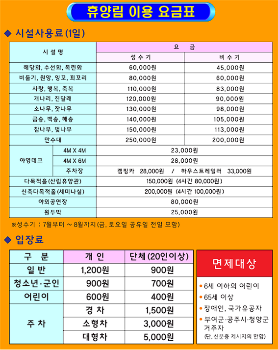 ❇️ 만수산자연휴양림 이용 요금표 ❇️