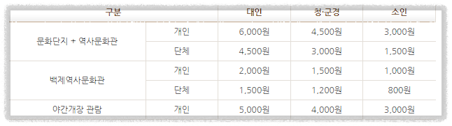 | ⏺️ 백제문화단지 - 자세히 알아보기 🛜 주소 : 충남 부여군 규암면 백제문로 455 이용시간 : 정기휴무 - 매주 월요일 / 자세한 시간 안내 위 표 참고해주세요. 문의 : 0507-1369-7290 이용료 : 위 표 참고해주세요 주차 : 무료 |