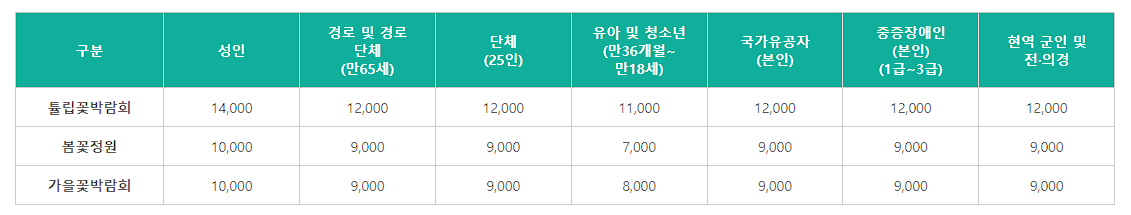 | ⏺️ 코리아플라워파크 - 자세히 알아보기 🛜 주소 : 충남 태안군 안면읍 꽃지해안로 400 이용시간 : 9시 ~ 18시 / 연중무휴 문 의 : 0507-1497-5536 이용료 : - 주차 : 무 료 |