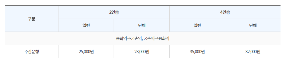 이용료 : 왕복 : 성인,청소년 - 7,000원, 초등학생 - 3,000원 / 편도 : 성인,청소년 - 4,000원 , 초등학생 - 2,000원