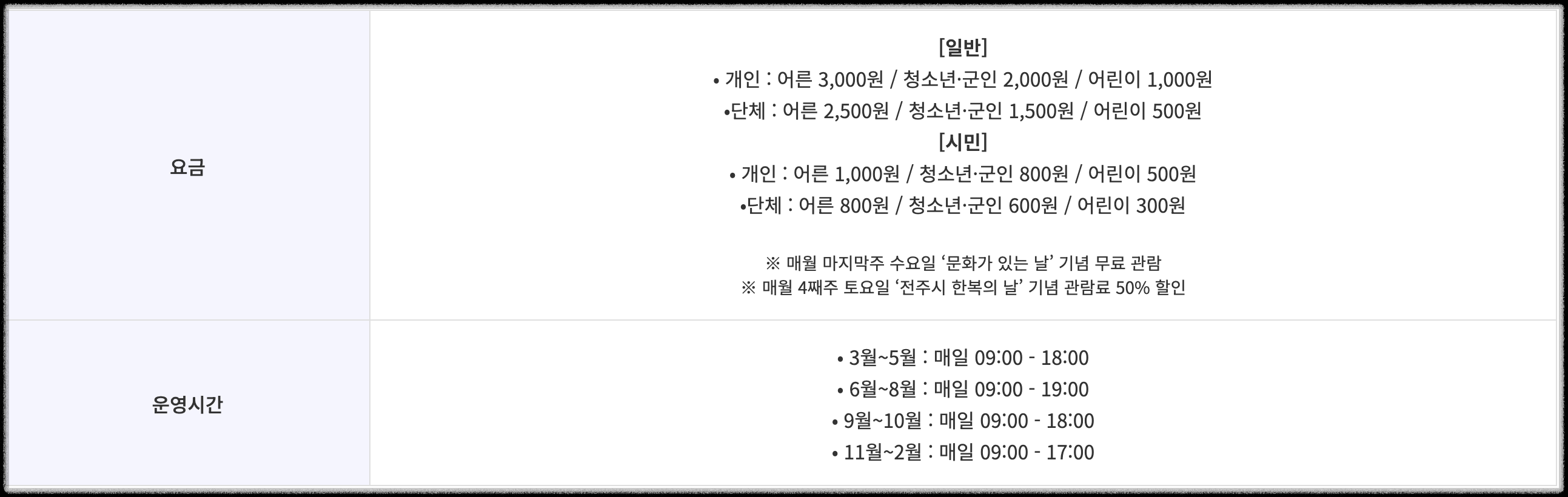 | ⏺️ 전주난장 주 소 : 전주시 완산구 은행로 13 이용시간 : 위의 표 참고. 문 의 : 063-244-0001 이용료 : 성인(7,500원), 중고생(6,500원), 36개월~초등(5,000원) 주 차 : 한옥마을 공영주차장 (도보 5분 거리) |