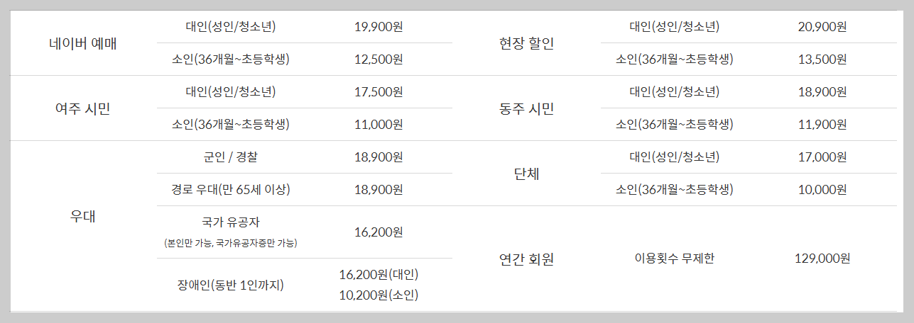 이용료 : 30개월~성인 - 9,000원 / 여주 주민,경로우대65세이상 - 7,000원