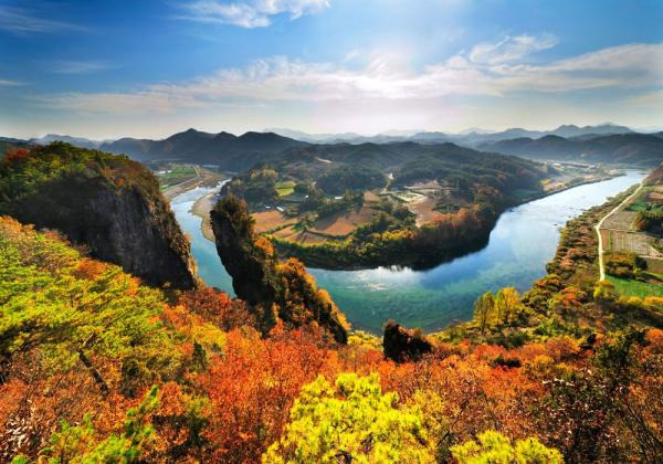 영월군 한반도면의 한반도지형 전망대는 지형이 한반도 모양을 닮아 많은 관광객의 발길을 끄는 곳입니다. 전망대에 오르면 한반도를 축소한 듯한 강줄기와 산세가 아름답게 펼쳐지며, 계절마다 색다른 매력을 선사합니다. 특히 가을에는 울긋불긋 물든 단풍과 어우러진 풍경이 장관을 이루어 사진 찍기 좋은 장소로도 유명합니다.