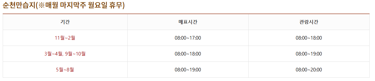| ⏺️ 순천만국가정원 - 자세히 알아보기 🛜 주 소 : 전남 순천시 국가정원1호길 47 이용시간 : 9시~21시 / 매표마감 19시 / 입장마감 20시 / 정기휴무 - 매월 마지막주 월요일 문 의 : 061-749-3114 입장료 : 성인 - 10,000원 / 청소년/군인 - 7,000원 / 어린이 - 5,000원 주 차 : 무 료 |